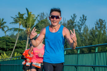 The 6km athletes set off under the illuminated evening skyline, enjoying the cooler temperatures and relaxed non-competitive vibe. Runners in this distance still receive their finish times. Heading the pack was Mike Goh in 31:25, followed 45 secs later by Hobert Labay and Wei Ming Dai 30 seconds further back. In the female event, Angie Teo took line honours in 35:59, with Sarah Quek closely behind in 36:16 and Jaslyn Tan a minute later in 37:20.